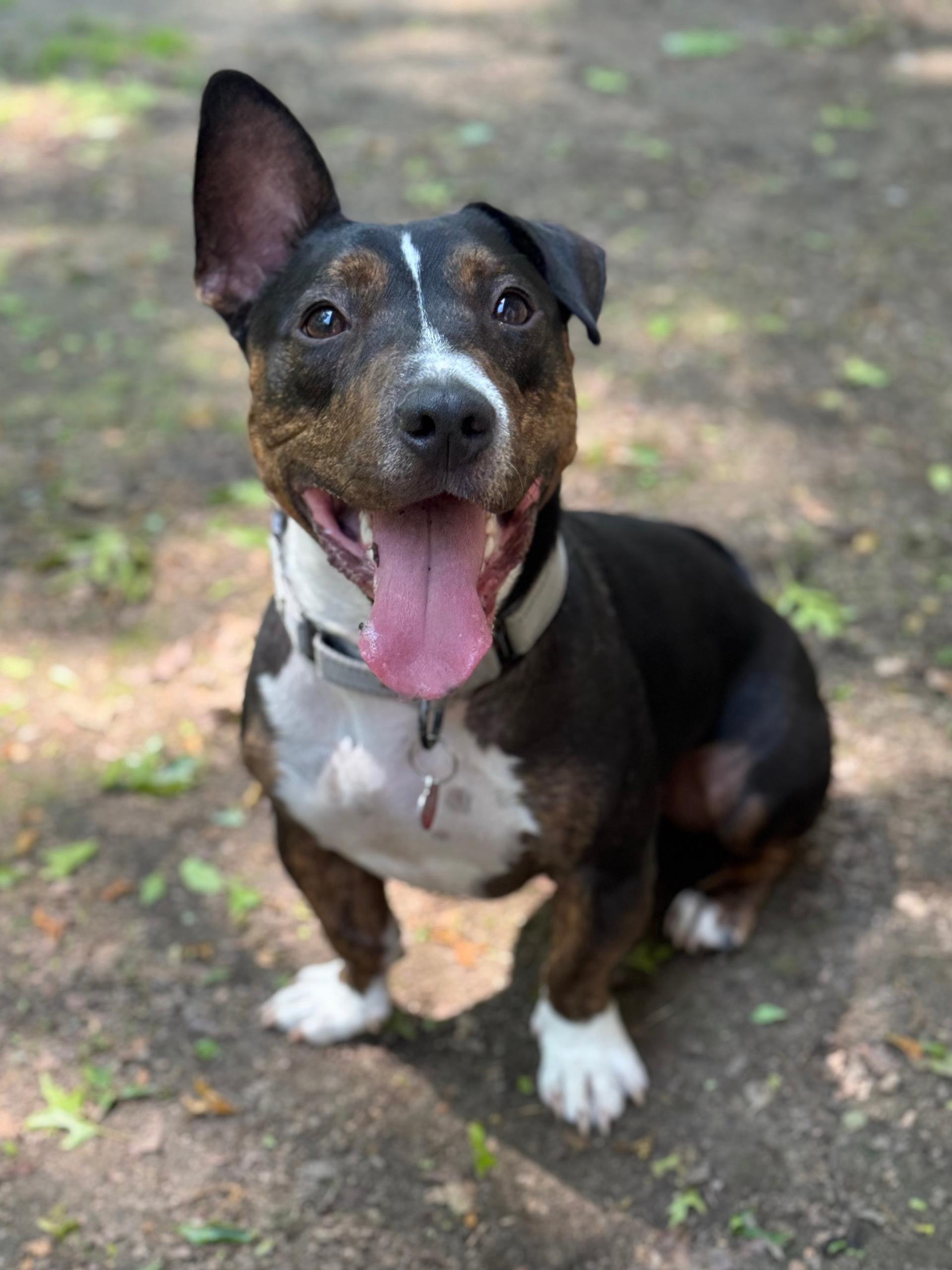 Red, White & BLUE! I'm a big-headed low-rider with a spirited personality and energy that could rival a 4th of July parade! You toss a ball, and I’m off! A game of fetch is my absolute favorite. With my playful spirit and all-American charm, I’ll have you smiling brighter than a sparkler on Independence Day.
